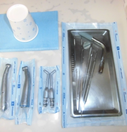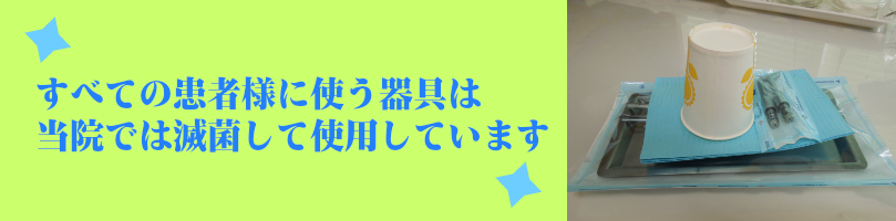 治療の時に口腔内を触る器具が入った基本セット。この基本セットを滅菌し患者様一人一人にたいしてパックをしています。このパックを行うことによって滅菌直後の器具が外気に触れることがないため清潔な状態を保つことができます。