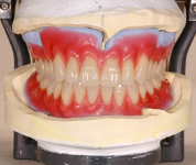 仮に歯を並べて最終チェックステップ③咬みあわせの高さも決まったのでそれをもとに上下の歯を並べて一度患者様に見ていただきます。高さ、見た目、頬の膨らみなどを確認していただき大丈夫そうなら次回完成となります。 |
